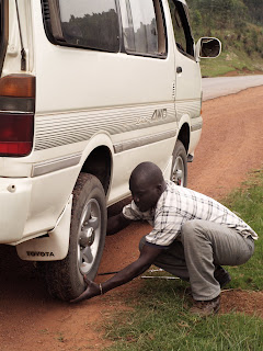 Next on the list was Lake Bunyonyi set in the midst of misty peaks at about 2000 meters. The journey to it was like travelling through Switzerland but with no snow. Amazing valleys and mountains soaring to about 2500m often terraced to produce as much food for the community as possible. Needless to say it was on one of these high passed that our car tyre exploded, taken in his stride by our highly experienced driver, Cosmas. The boys were very excited by the sight of the jack lifting the car with little effort.